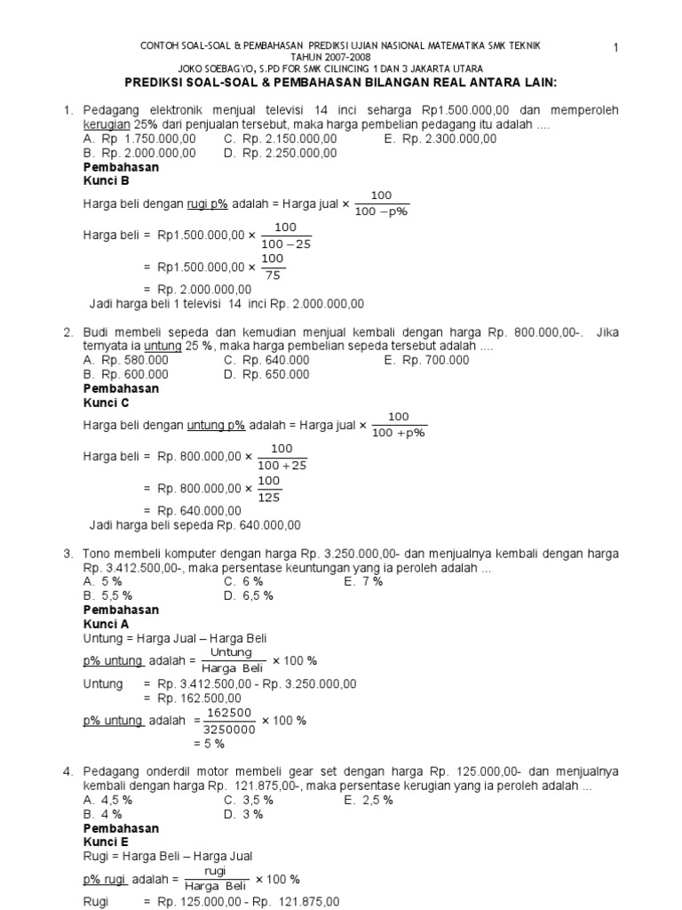 Über 7 millionen englischsprachige bücher. Pilihlah salah satu jawaban yang benar dengan memberi tanda silang (x) pada huruf a, b, c, d dan e! Seperti yang kita tahu bersama bahwa pemerintah kembali membuka pelaksanaan seleksi p3k / pppk bagi guru honorer maupun instansi lainnya. Ruang belajar siswa kelas 8 contoh soal unbk matematika smk akuntansi soal latihan dan pembahasan un matematika smk 2017 soal dan jawaban latihan un matematika smk akuntasi tahun 2018 Soal pppk p3k matematika smp sma smk dan kunci jawaban tahun 2021 berikut ini adalah contoh soal seleksi guru pppk p3k matematika dan kunci jawaban tahun 2021. Contoh soal dan pembahasan bentuk pangkat dan akar materi matematika kelas x sma. Contoh soal matematika un smk. Berikut ini merupakan soal disertai pembahasannya ulangan umum matematika kelas xii semester ganjil tahun ajaran 20172018 smkn 3 pontianak yang penulis arsipkan sebagai bahan referensi untuk belajar. Savesave soal matematika kelas xii smk for later. • acuan yang digunakan dalam menyusun tes ujian nasional. Contoh soal dan jawaban usbn pendidikan agama islam kelas 12 smk/sma 2019 (copy). Prediksi soal unbk smk matematika. Menjelang pelaksanaan ujian akhir, di kesempatan ini admin akan membagikan contoh soal usbn matematika smk dan jawaban tahun 2022 dalam format online dan pdf secara gratis.